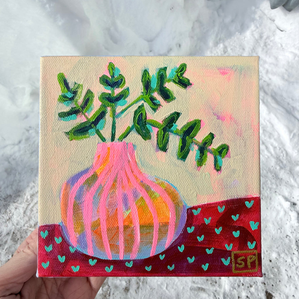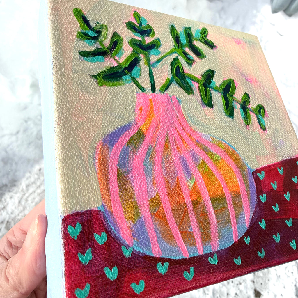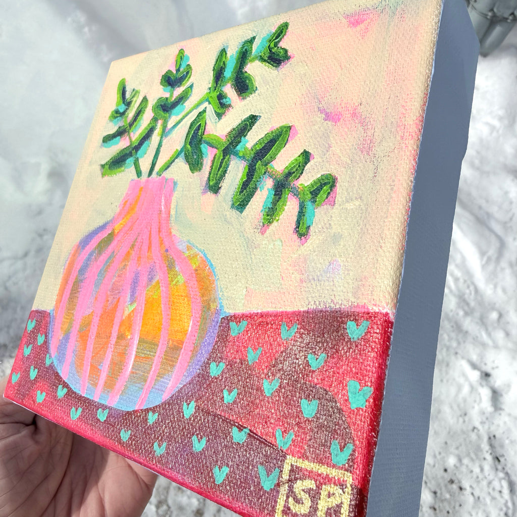 Treat yourself to a little love this Valentine's Day with this charming 6" x 6" x 1.5" acrylic painting on gallery canvas. Hang it solo for instant impact, or go bold and create an adorable gallery wall moment. Either way, it's ready to go and guaranteed to make you smile every time you walk by.